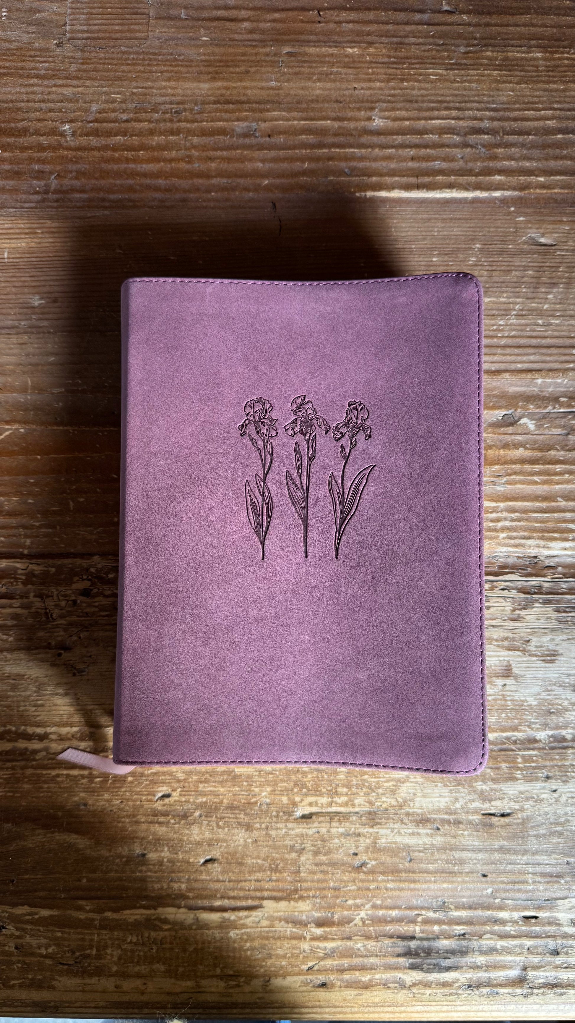 This ESV journaling Bible is a rich mauve, soft-touch, treasure with engraved irises gracing the front cover. The words “Behold, I am making all things new” from Revelation 21:5 are scripted on the back as an encouraging reminder of God’s sovereign and redemptive heart. Our prayer for you would be that this Bible invites you into new depths of the Lord’s love for you and his desire to make you a new creation.