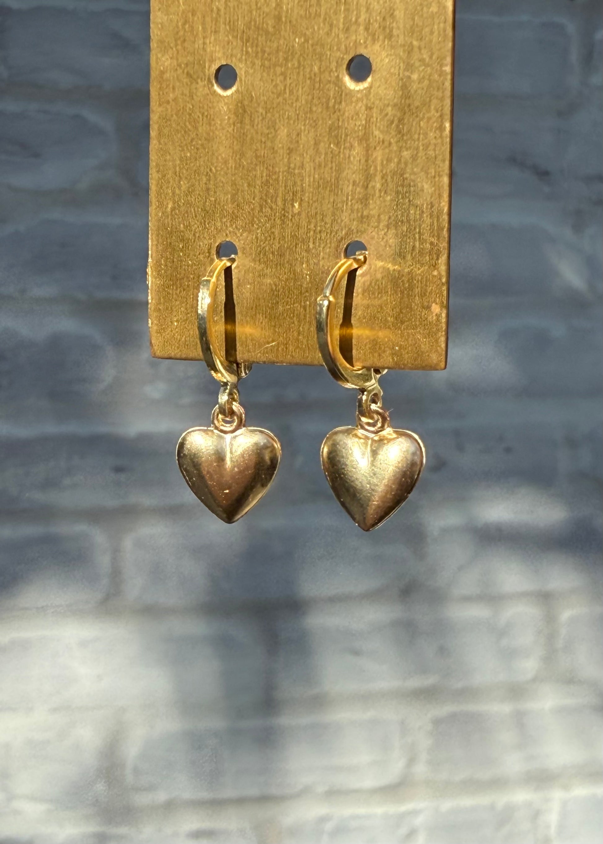 14k gold filled hearts dangle from huggie style hoops. Lightweight.
