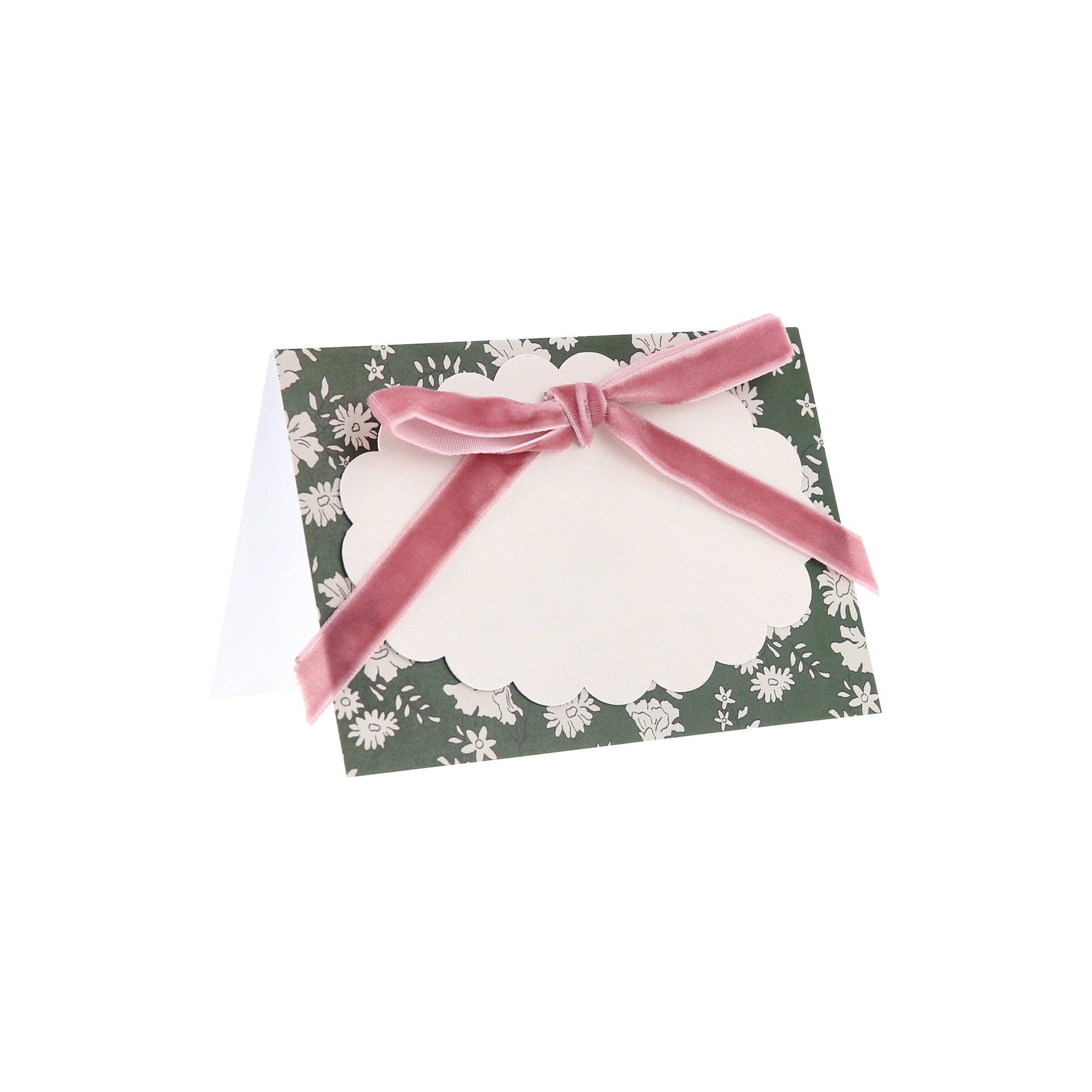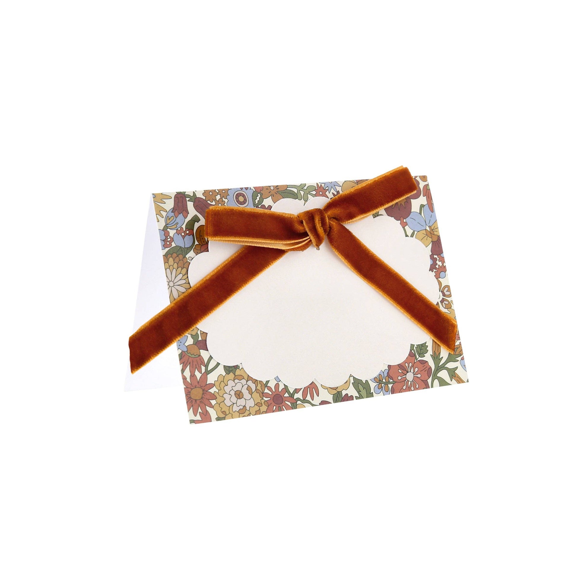 Add a charming touch to your table with this set of 6 paper place cards, each showcasing a unique Liberty floral pattern in cozy fall shades. Adorned with plush velvet bows in colors like burnt orange, muted gold, teal, sage, berry red, and dusty pink, they shimmer with subtle matte gold foil accents. Every card includes a scalloped tag perfect for writing guest names, plus 12 extra tags so you can use them again and again. Measuring 4.25 x 3 x 0.25 inches, this colorful pack makes setting the scene for festive gatherings a breeze.