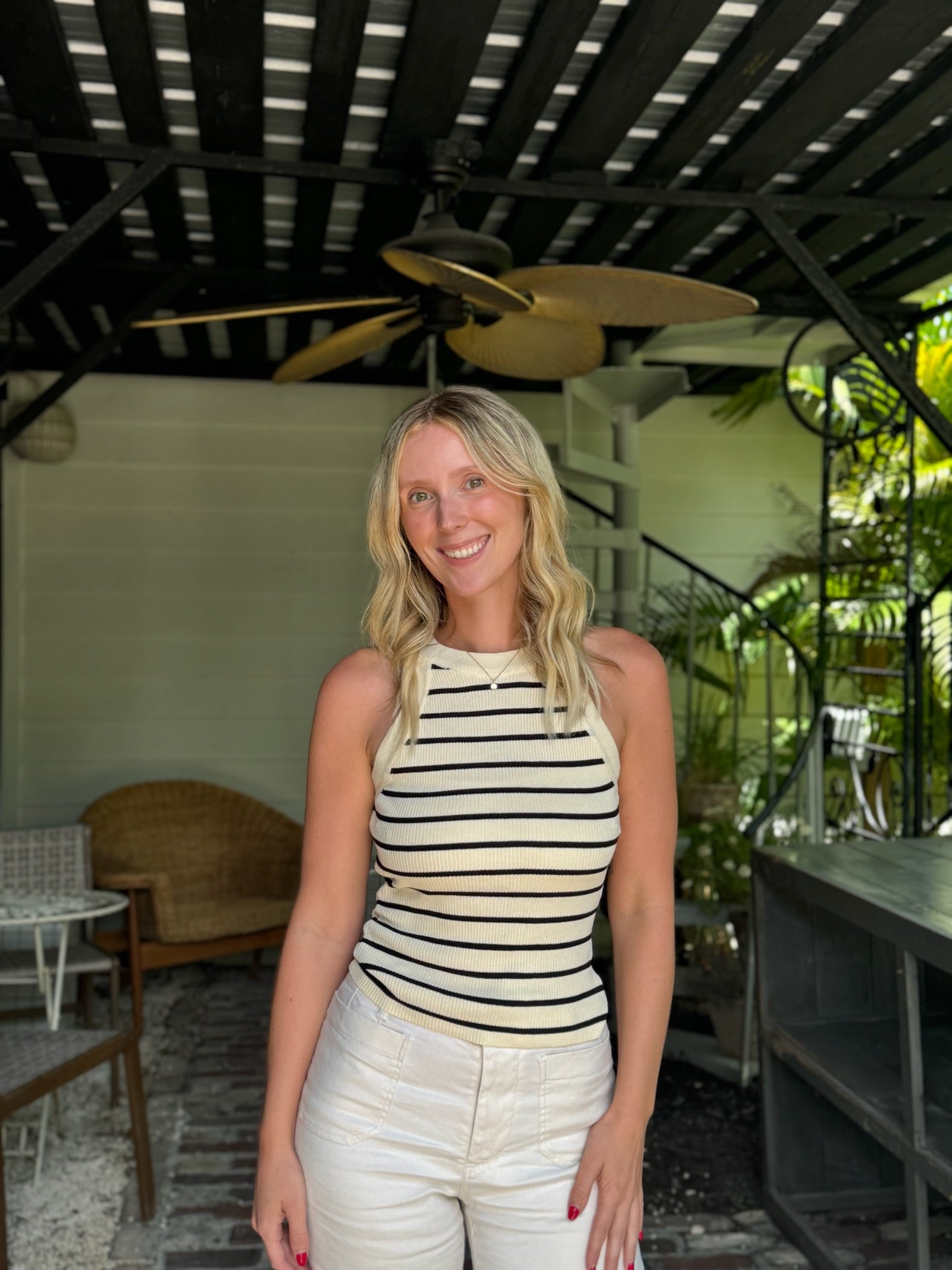 This playful knit sweater features a ribbed striped design that adds a fun twist to your everyday look. The round neck and sleeveless cut make it perfect for layering or wearing solo on warmer days. Soft and cozy, it keeps you comfortable while showcasing your style with a lively, textured pattern. Add a pop of pattern to your wardrobe with this versatile tank top that blends casual comfort and eye-catching detail effortlessly.