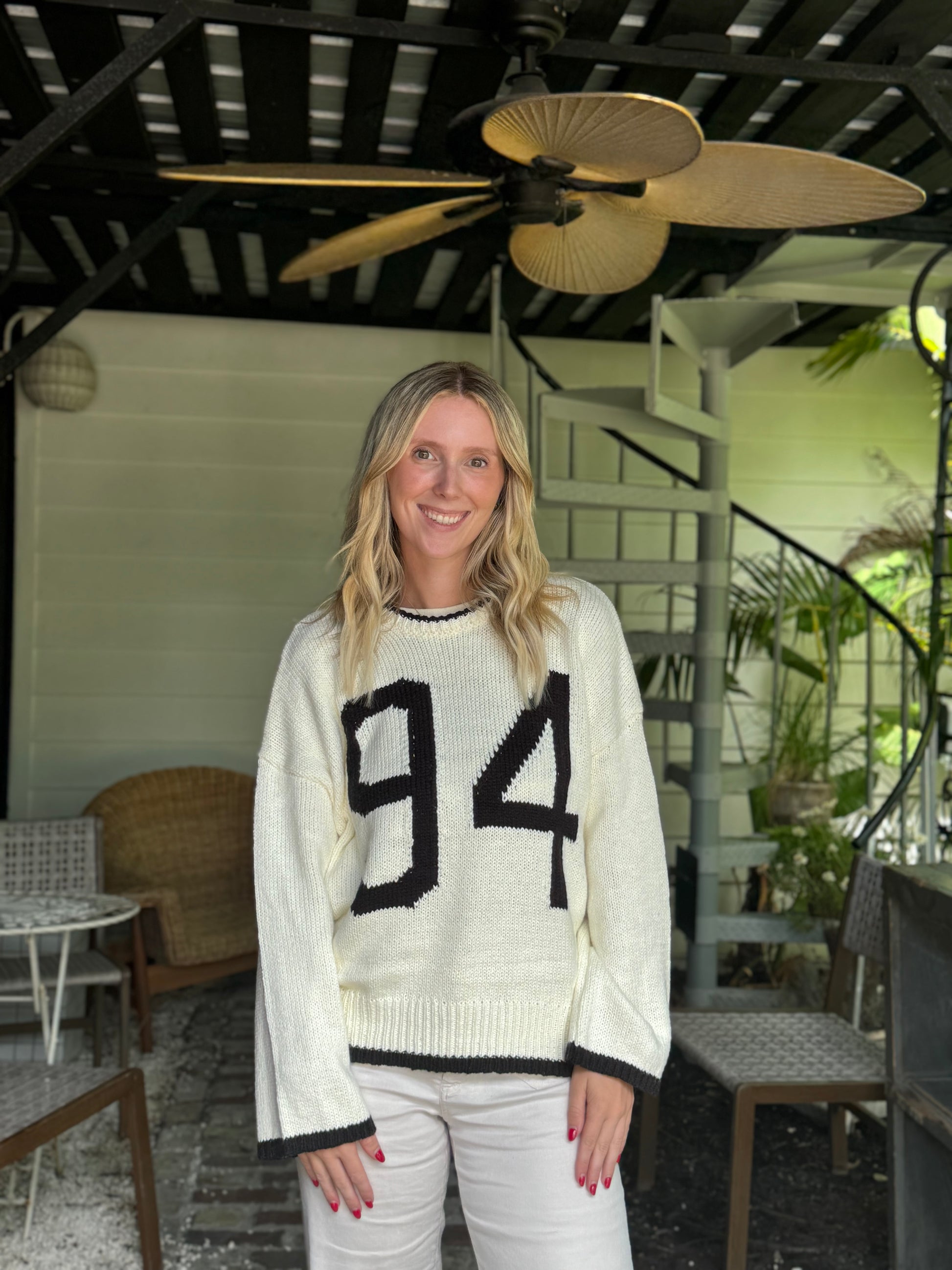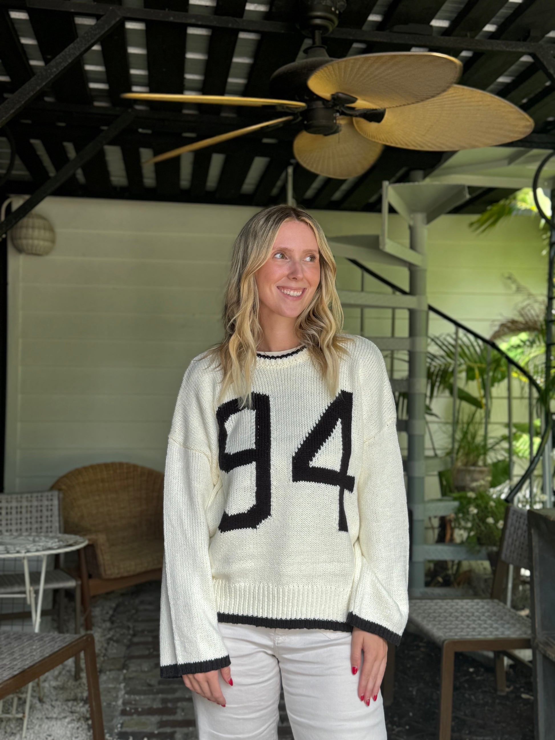 Get cozy and stylish with the "94" Knit Crewneck, your new favorite go-to pullover. This cotton knit sweater features a soft crew neck and long sleeves designed for comfort in any season. The standout printed number graphic on the front adds a sporty, playful touch, while the subtle striped detail brings in a hint of retro charm. Perfect for layering or wearing solo, it pairs effortlessly with jeans or joggers for a laid-back, fun look. Embrace casual cool vibes without sacrificing warmth or comfort.